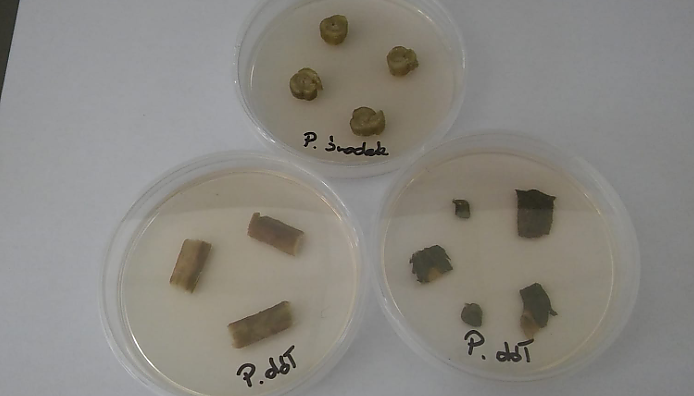 Po zastosowaniu Agro ECA ponownie pobrano fragmenty chorej rośliny. Na odcinkach łodygi z dolnej i środkowej części rośliny nie zaobserwowano wycieków bakteryjnych, natomiast w górnej części rośliny, wycieki były nieznaczne (fot. 4 – 5). Nie zaobserwowano żadnych objawów fitotoksycznych na roślinach, którym podawano Agro ECA. Z tych testów wynika, że jest możliwe ograniczenie infekcji bakteryjnych roślin, ale powinno się powtarzać zabiegi co 1-3 tygodni, aby ograniczyć do poziomu nie stanowiącego zagrożenia dla roślin.