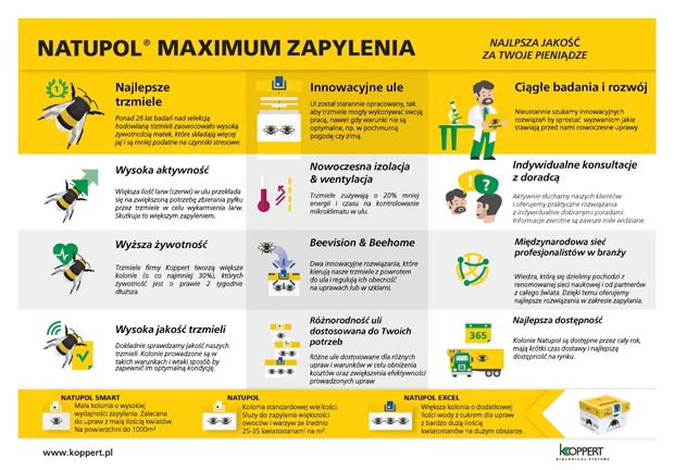 Coraz większa liczba upraw na świecie jest zapylania przez trzmiele. Wprowadzenie tych owadów zapylających w uprawach pod osłonami od lat 80. XX w. przyniosło spektakularny wzrost wielkości plonów oraz lepszą jakość pomidorów, różnych typów roślin dyniowatych, owoców miękkich, pestkowych i upraw nasiennych. Prowadzi to do poprawy wykształcania się nasion i owoców, lepszego kształtu i wielkości owoców oraz większej przydatności ich do przechowywania. Stworzone przy użyciu najnowszych technologii ule firmy Koppert odzwierciedlają ponad 26 lat innowacji i nieustannego doskonalenia prac badawczo-rozwojowych.