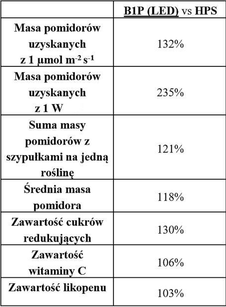 Ze wszystkich przetestowanych widm, najlepszy wpływ na wzrost i owocowanie przyniosło widmo LED B1P skomponowane na bazie światła białego o temperaturze 4000 K, z dodatkiem światła czerwonego. Widmo to przyniosło też lepsze wyniki niż lampa sodowa. W jego przypadku wzrosła nie tylko średnia ilość dopuszczalnych do sprzedaży pomidorów, ale również ich masa. Przeciętny wyprodukowany owoc ważył o 20% więcej niż pomidor spod lampy HPS, pomimo zastosowania lamp LED o dwukrotnie mniejszej mocy. W eksperymencie porównano lampy 250 W HPS ze 125 W LED-owymi.