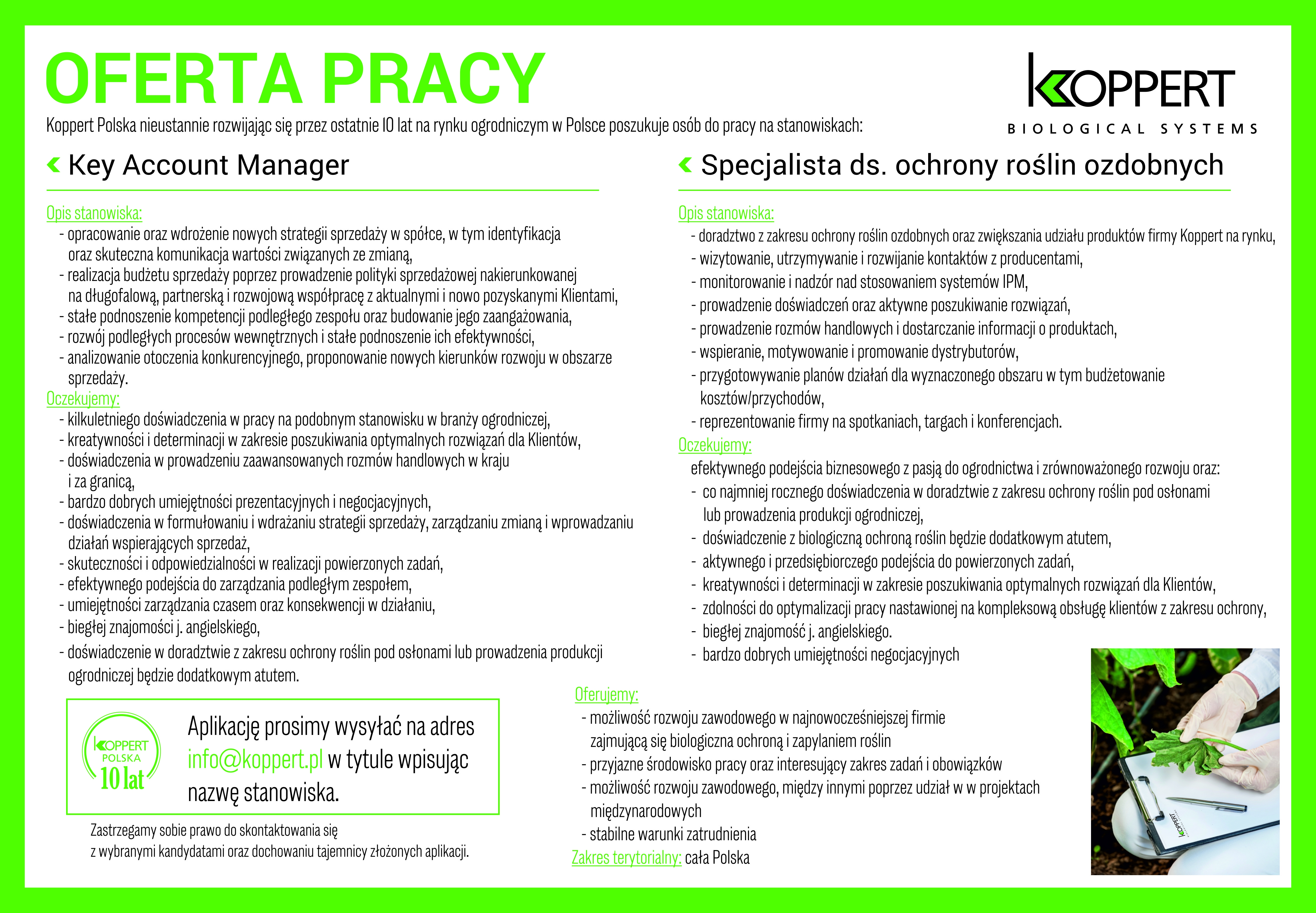Aplikacje prosimy wysyłać na adres: info@koppert.pl w tytule wpisując nazwę stanowiska.