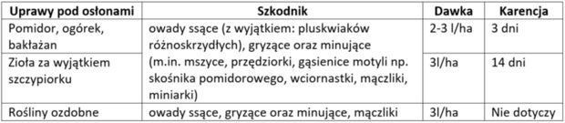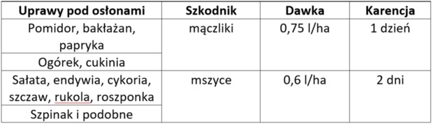 Jedna aplikacja chroni uprawy przez ok. 6 tygodni. Przy dużym zasiedleniu zabieg należy powtórzyć po 10 -14 dniach.