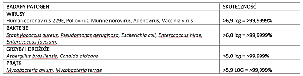 Badania wykonane w marcu 2021 roku na zgodność z normą EN 17272 (dezynfekcja poprzez zamgławianie) wykazały bardzo dużą skuteczność kwasu podchlorawego w zwalczaniu 14 patogenów (bakterii, grzybów, wirusów, prątków) metodą zamgławiania tzw. suchą mgłą o wielkość kropli poniżej 10 mikronów (tabela).