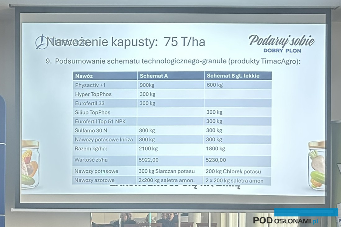 Tomasz Marasik – przedstawiciel firmy Timac Agro – proponował konkretne rozwiązania do nawożenia doglebowego. Nawożenie doglebowe fasoli szparagowej opiera się na precyzyjnym dostarczeniu składników pokarmowych jeszcze przed siewem lub we wczesnych fazach wzrostu. Według przedstawionych zaleceń na 1 ar stosuje się: 10 kg nawozu Physiomax, 10 kg nawozu Eurofertil TOP 49 NPS oraz 5 kg siarczanu potasu. Na glebach słabszych warto dodatkowo zastosować około 3 kg nawozu Sulfammo 23, aby poprawić zasobność w siarkę i azot. Opcjonalnie można wykorzystać kondycjoner glebowy, a także preparat Inrizza w dawce 5 kg na ar. Wspiera on zasiedlenie strefy korzeniowej przez korzystne mikroorganizmy. Całkowity koszt nawożenia doglebowego wynosi około 60 zł na ar, a w wersji rozszerzonej około 75 zł na ar.
