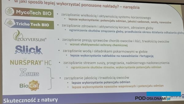 Kolejny element, gdzie koszty można lepiej wykorzystać, to ochrona roślin. Stosując klasyczne środki ochrony roślin, można osiągnąć skuteczność na poziomie 80-90-100%. M. Oleszczak jest zdania, że niektórymi metodami można spokojnie ograniczyć np. inokulum grzybów chorobotwórczych, które atakują owoce czy liście i w ten sposób ograniczyć, czy lepiej wykorzystać efektywność środków ochrony roślin.