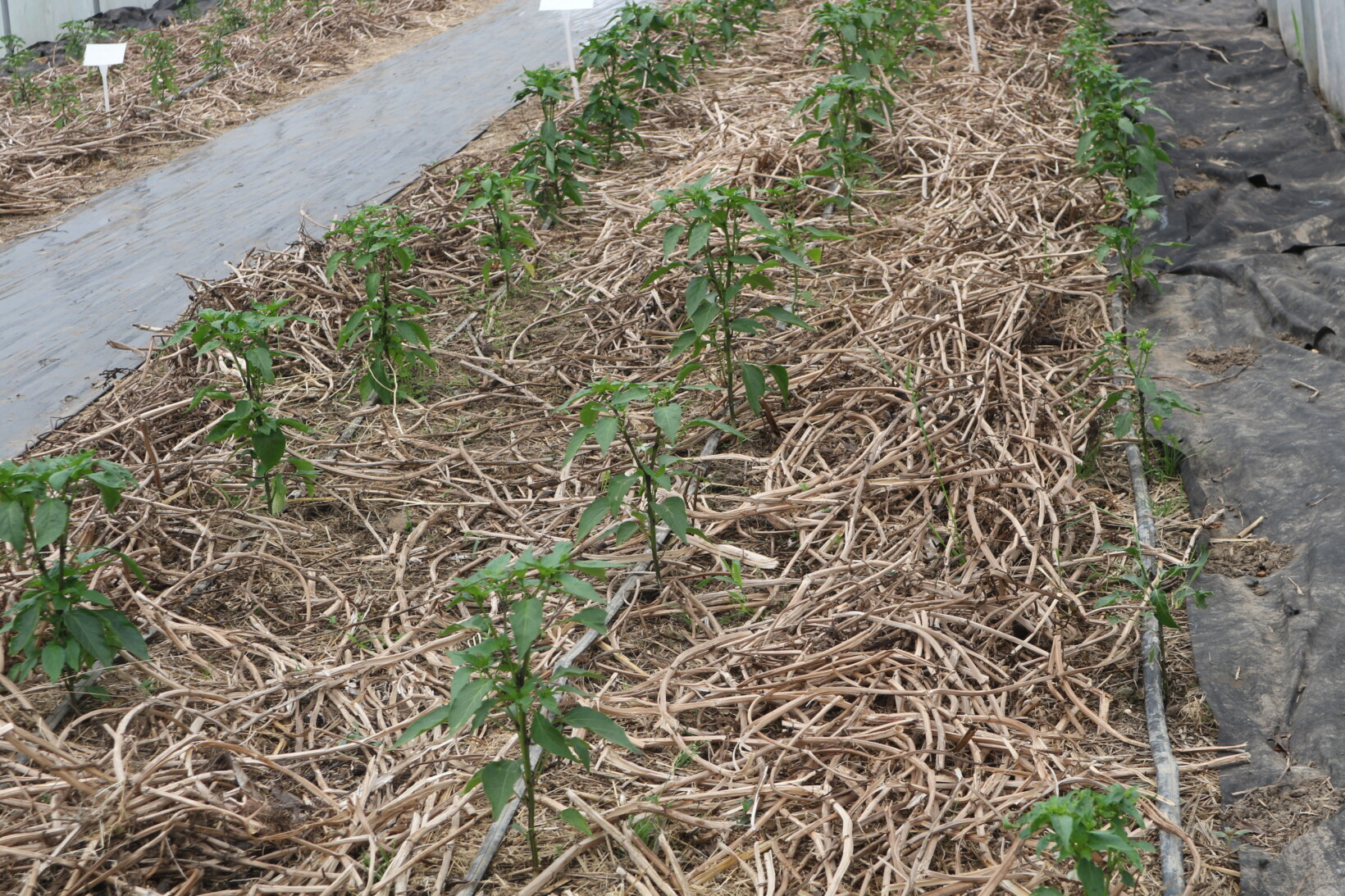 Oprócz włączania do płodozmianu roślin poprawiających właściwości i żyzność gleby w tunelach dr hab. Piotr Siwek prof. UR wskazał, że od kilku lat prowadzone są również badania nad materiałami biopolimerowymi. Opracowana technologia produkcji i prototypy takich materiałów są dostępne ale jeszcze nie wprowadzone na szerszą skalę. Są one wykonane z PBS (polibursztynianu butylu), PLA (polikwasu mlekowego) oraz polipropylenu z dodatkiem fotodegradantów i w określonych warunkach podlegają procesom degradacji. Mają one postać sznurków do podwiązywania roślin, włóknin do ściółkowania i cylindrów. Do doświadczenia użyto cylindrów z włókniny wykonanej z PLA, które wypełniono glebą i posadzono w nich rozsadę papryki słodkiej typu blok odmiany King Arthur, cechującej się niskim pokrojem, wczesnością i łatwością wybarwiania. Koniecznym zabiegiem było przytwierdzenie cylindrów patyczkami bambusowymi, gdyż po nawodnieniu nie były stabilne. Rośliny uprawiane w pierścieniach ze względu na ograniczoną objętość szybko nagrzewającego się podłoża miały lepsze tempo wzrostu, a owoce dojrzewały szybciej. Taka forma uprawy jest wskazana, gdy z różnych względów jesteśmy zmuszeni do częściowego odizolowania roślin od gruntu.