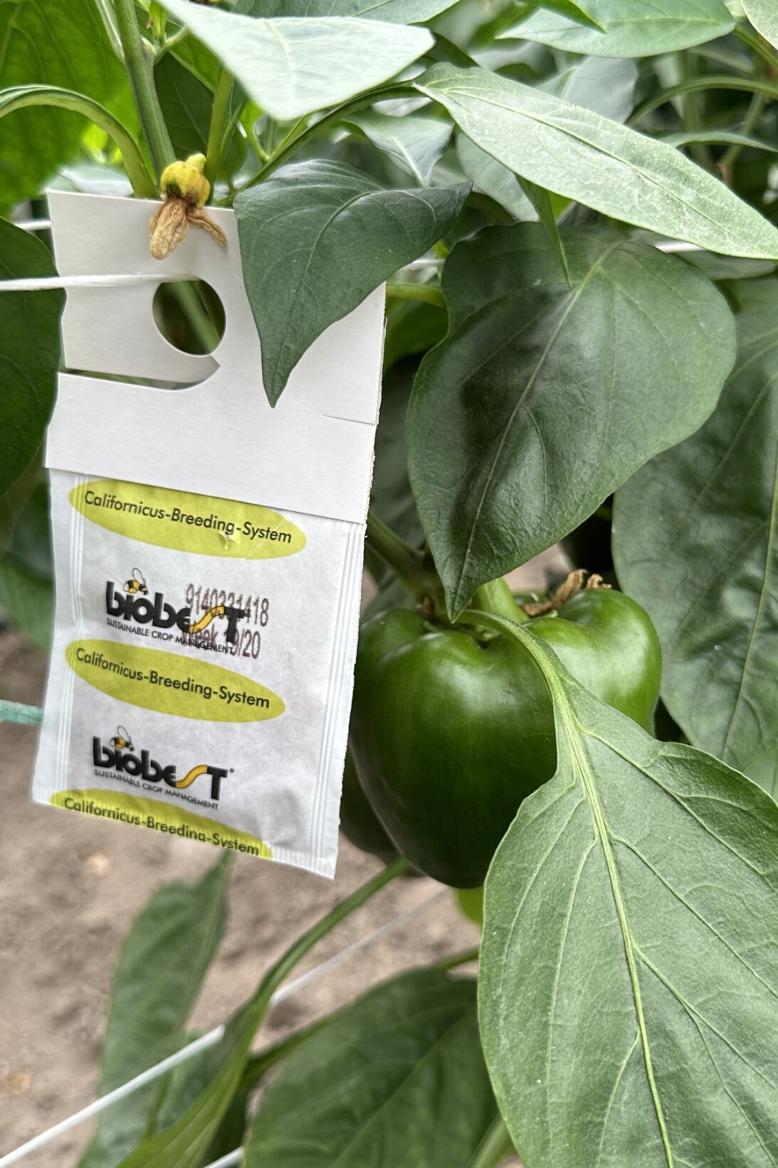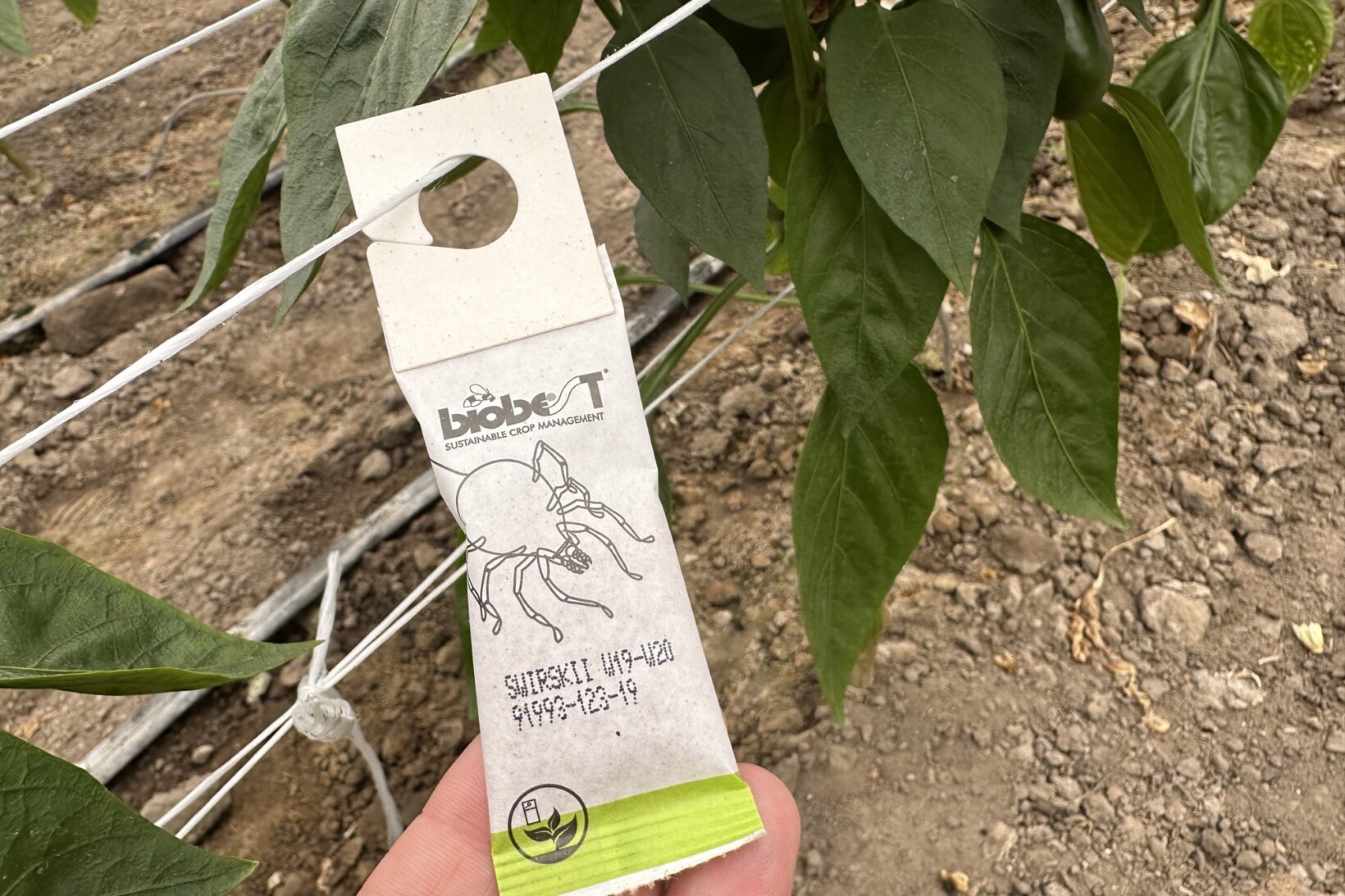 Na plantacji na roślinach nie było widać objawów wskazujących na obecność szkodników. Producent zadbał o to, aby ograniczyć ich populację, gdy była jeszcze na niskim poziomie. Głównym problemem w poprzednich latach uprawy były wciornastki i przędziorki. Obecnie w tunelu ochrona opiera się na produktach z mikroorganizmami. Zostały rozwieszone saszetki z drapieżnymi roztoczami Neoseiulus californicus oraz Amblyseius swirskii. Roztocze A. swirskii przeznaczone są do zwalczania młodych larw różnych gatunków wciornastków oraz jaj i larw mączlika, podczas gdy N. californicus jest drapieżcą przędziorków i roztoczy. Przędziorki od momentu pojawienia się pierwszych osobników ogranicza także parazytoid szkodników – pryszczarek przędziorkojad (Feltiella acarisuga) dostępny jako produkt Spidend. Najczęściej zalecany jest razem z drugim produktem zawierającym żywe organizmy – drapieżnego roztocza Phytoseiulus persimilis – Spidex Vital. W przypadku tego pierwszego produktu butelkę umieszcza się na podłożu, na macie, a w przypadku Spidex Vital zawartość rozsypuje się na powierzchnię blaszki liściowej. W przypadku organizmów pożytecznych warto skontaktować się z dystrybutorem i dobrać odpowiednie gatunki do sytuacji we własnym gospodarstwie i warunków termicznych.