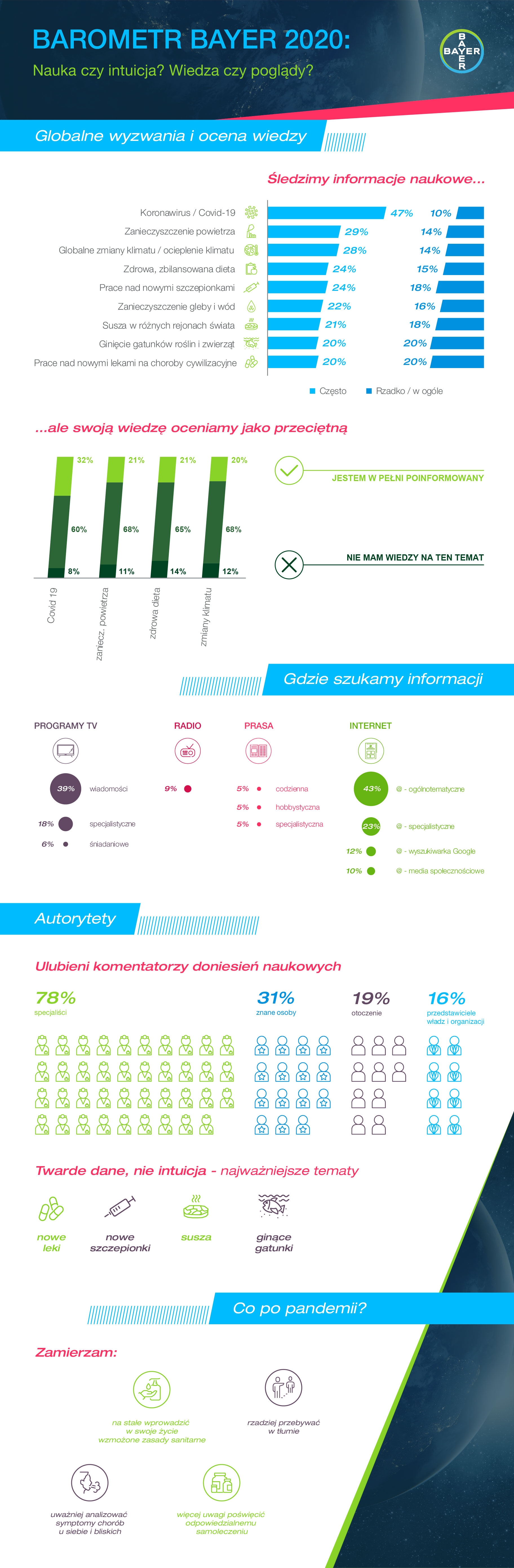 Ostatnie miesiące mogły skłaniać do silniejszego przyglądania się problemom współczesnego świata. Pandemia, susza, powodzie dotykają nas bezpośrednio, ale czy sprawiają, że z większą uwagą śledzimy informacje na te tematy? Gdzie szukamy informacji, kto jest dla nas autorytetem, czy widzimy lokalny wymiar globalnych problemów? Najnowsza edycja badania opinii społecznej „Barometr Bayer”, odpowiada na te pytania.