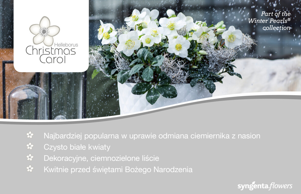 Podczas targów Zieleń to Życie 2024 firma Syngenta Flowers zaprezentowała ciemiernik biały (Helleborus niger) Christmas Carol. Christmas Carol to wczesna odmiana tego bylinowego gatunku, rozmnażana z nasion (zakwitająca w pierwszym roku produkcji), o wzniesionym pokroju, licznych czysto białych kwiatach oraz ciemnozielonych liściach mocnej budowy. Polecana jest ogrodnikom do doniczkowej uprawy pod osłonami i sprzedaży w postaci kwitnących okazów w okresie poprzedzającym Święta Bożego Narodzenia (centra ogrodnicze, markety budowlane i supermarkety, kwiaciarnie) – w zachodniej Europie handel rusza już od października. Ciemiernik przeznaczony jest wówczas do dekoracji wnętrz, a następnie, po upływie około dwóch tygodni – ozdoby balkonu lub tarasu czy ogrodu (jako bylina posadzona na rabacie).