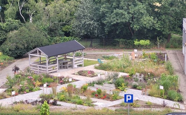 Ogród w pierwszej części bazuje na rabatach stymulujących cztery zmysły: wzrok (4 kolory), dotyk (dłoni – rośliny o różnych fakturach posadzone na wysokim zagonie, stóp – różne podłoża na ścieżce sensorycznej), węch (pachnący zakątek), słuch (rabata traw i ogród wodny dostarczają dźwięków). W drugiej części ogrodu znajduje się altana, w której można prowadzić zajęcia praktyczne. Ten jego fragment obejmuje również: trawnik, rabatę iglasto-wrzosowatą i łąkę kwietną. Trzecia część ogrodu ma charakter użytkowy – z warzywnikiem, kwiatownikiem (warzywnik kwiatowy) oraz planowanym minisadem.