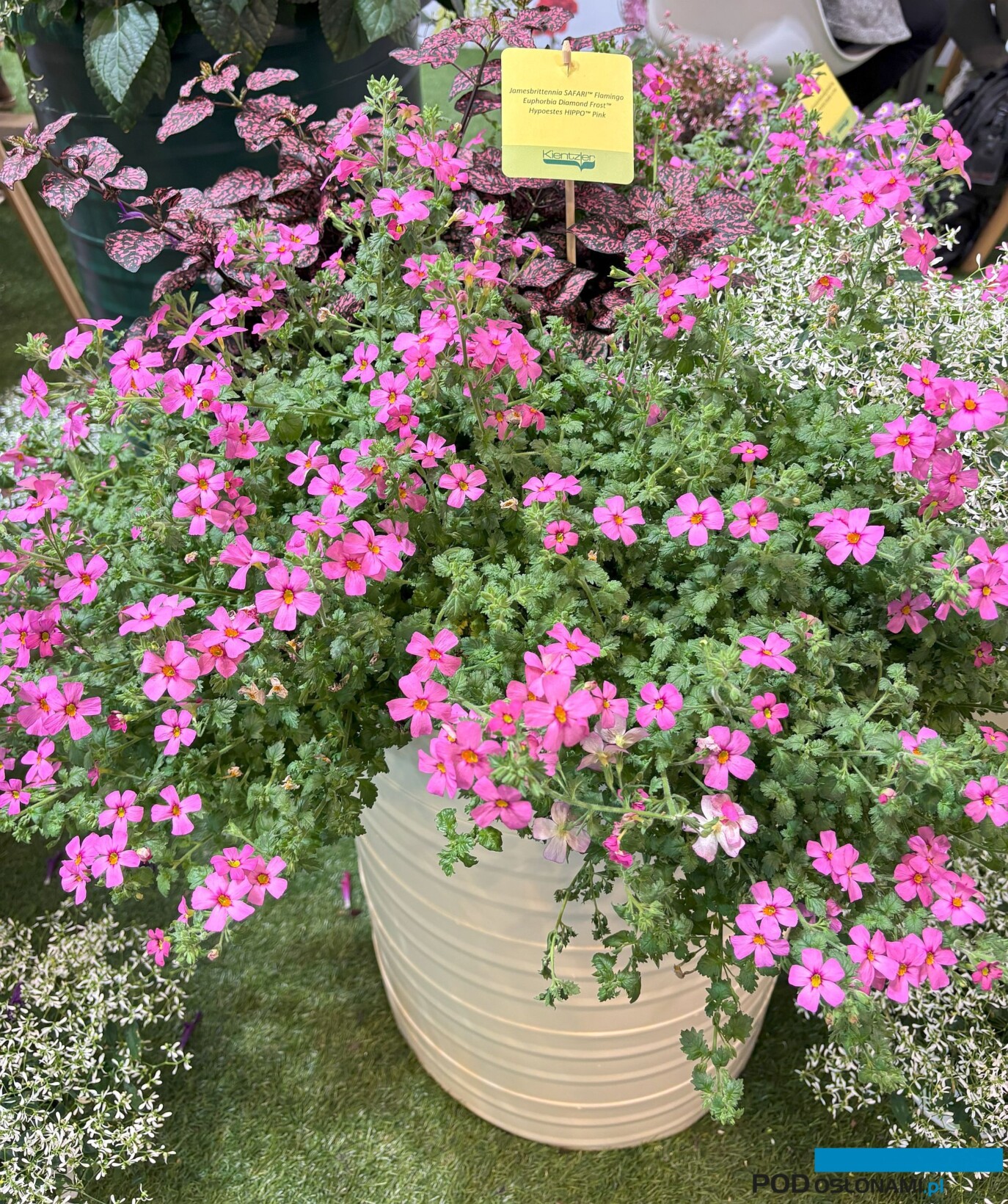 Na naszym kontynencie – w przeciwieństwie do Ameryki Płn. – wciąż natomiast mało popularna jest Jamesbrittenia, która również znalazła się na stoisku PW: pokazano odmiany z grupy Safari, w tym szczególnie atrakcyjną Flamingo o intensywnie różowych kwiatach. Rośliny te dobrze znoszą upał. Nawiązując do ulepszonych kreacji hodowlanych, Paweł Marcinkowski wskazał również, rozmnażaną wegetatywnie gomfrenę (Gomphrena) Truffula Pink – obecnie oferowana, lepiej się krzewiąca wersja tej odmiany nosi przydomek „2025”.