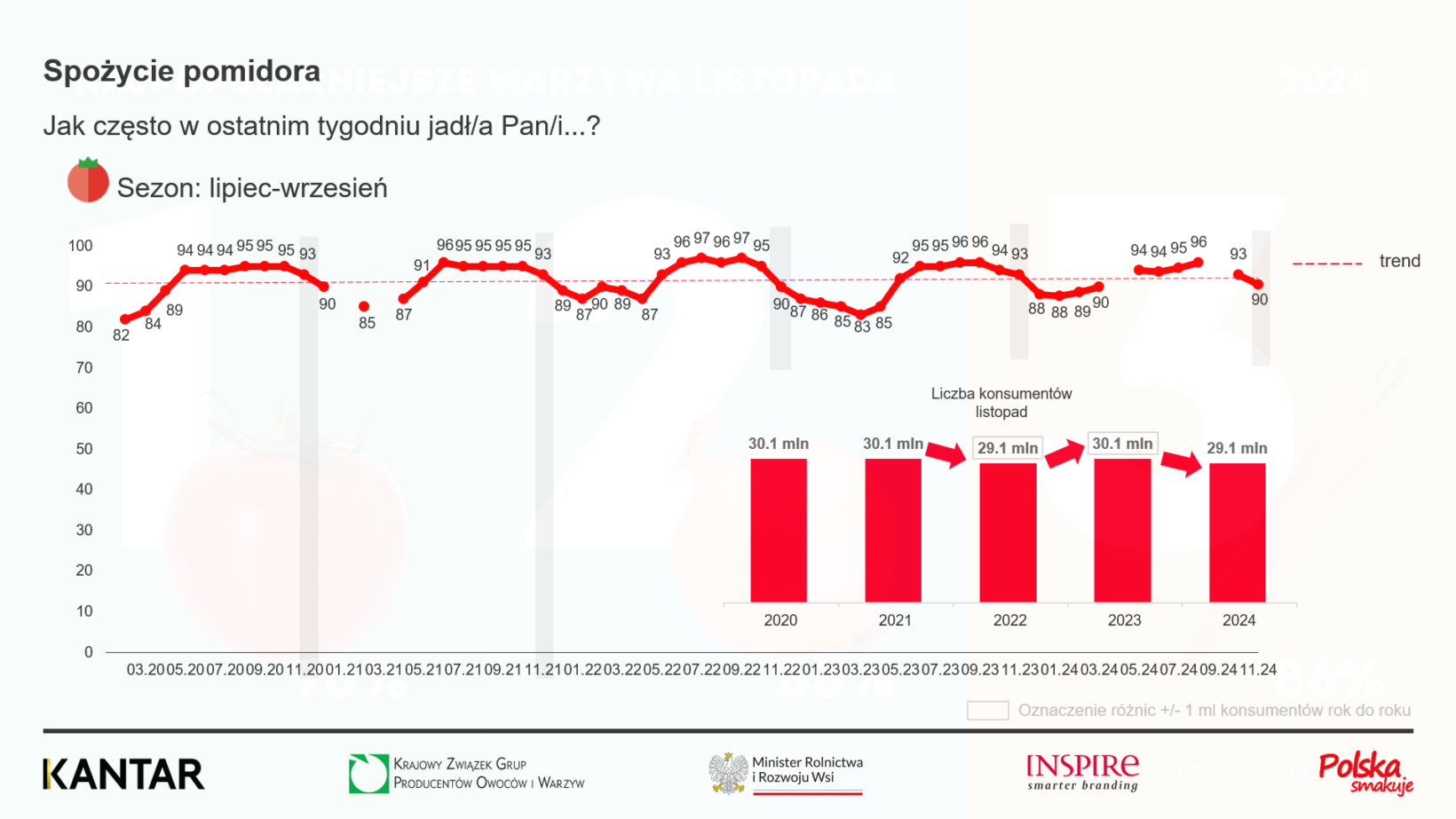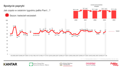 Badanie zrealizowano w dniach 11-16 października 2024 r., na reprezentatywnej próbie 1015 Polaków w wieku 15 lat i więcej. Wywiady bezpośrednie w domach respondentów (CAPI). Kantar pyta respondentów o częstotliwość spożywania 20 gatunków w ostatnim tygodniu i o spożywanie warzyw, owoców i ich przetworów podczas poszczególnych posiłków w dniu poprzedzającym badanie.