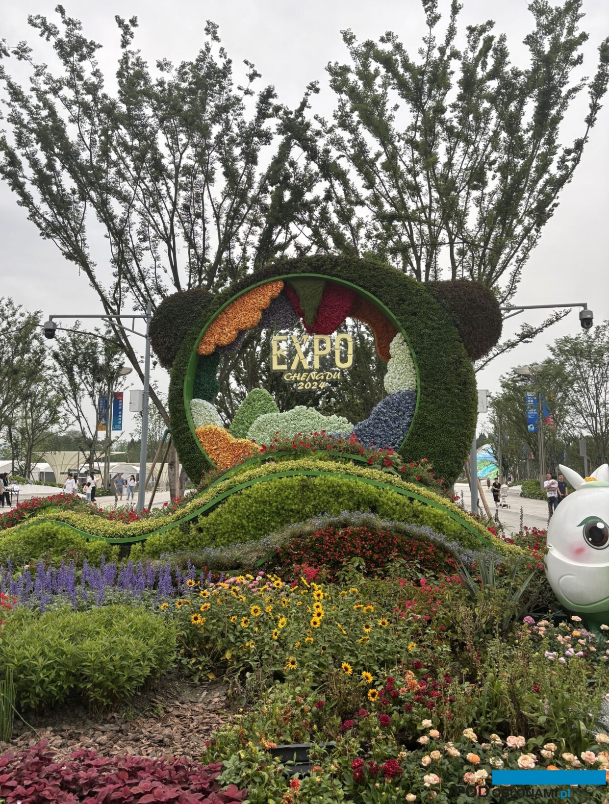 W powszechnym odbiorze Chengdu kojarzone jest z pandą wielką (w mieście znajduje się Centrum Badań nad Hodowlą Pandy). Nic dziwnego, że znalazła się w logotypie expo, który bazuje na zarysie głowy tego zwierzęcia, ale także zawiera elementy roślinne charakterystyczne dla miejsca tegorocznej międzynarodowej wystawy ogrodniczej: miłorząb (Ginkgo biloba), hibiskus (Hibiscus mutabilis rośnie licznie w parkach, wzdłuż brzegów rzek i dróg w Chengdu) oraz bambus – Phyllostachys aurea.