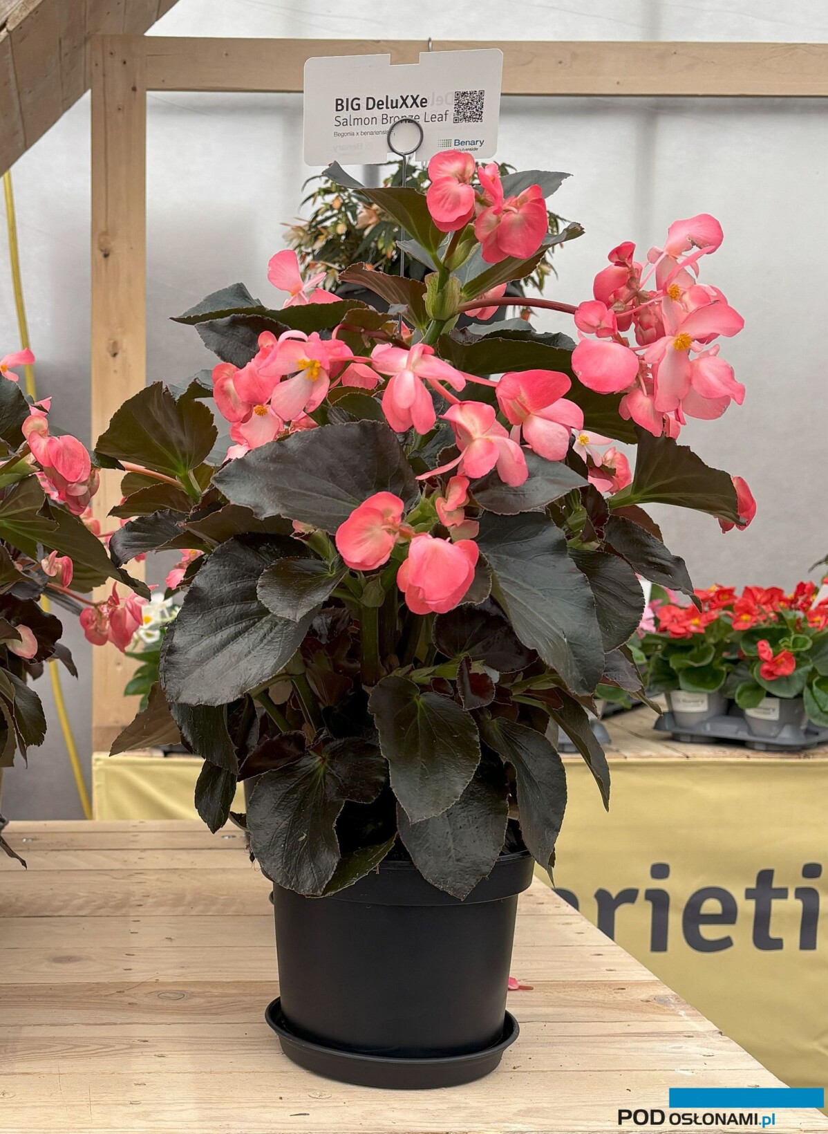 Begonia. W grupie odmian rozmnażanych z nasion J. Majchrzak rekomendował m.in. nową odmianę BIG Deluxxe Salmon Bronze Leaf gatunku Begonia ×benariensis (miała premierę podczas holenderskich FlowerTrials 2025 w firmie Benary), o okazałych rozmiarach, wysokości do 80 cm, polecaną do uprawy w dużych pojemnikach.