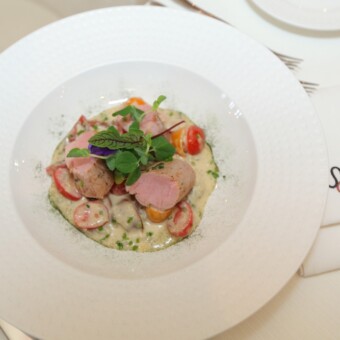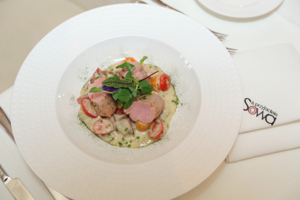 Marynowane w tymianku polędwiczki wieprzowe z sosem serowym i pomidorkami koktajlowymi