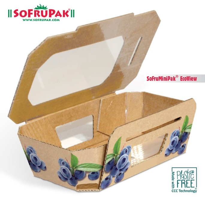 W pełni biodegradowalne opakowanie SoFruMiniPak® Ecoview na owoce i grzyby, wyprodukowane z surowców odnawialnych – z tektury falistej i zintegrowanej z nią celulozowej folii zasłaniającej „okienko” w pokrywce. Projekt opakowań jednostkowych i zbiorczych zapewnia dobrą cyrkulację powietrza i optymalne schładzanie produktów. Opakowanie jest w 100% biodegradowalne, nie zawiera plastiku.