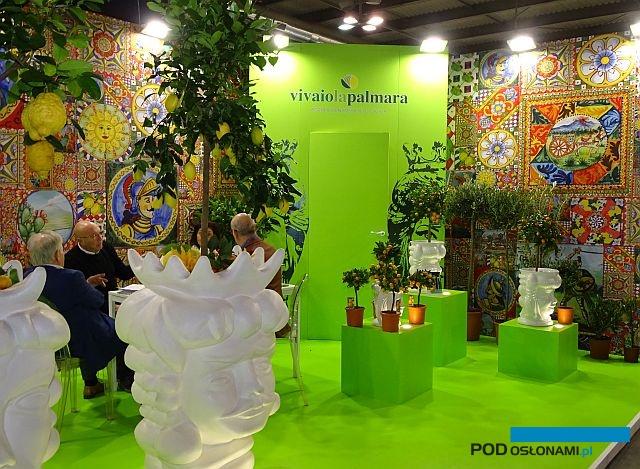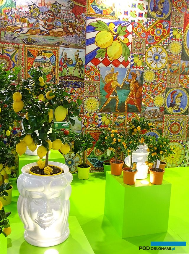 Z opisanym powyżej stoiskiem sąsiadowało inne wyróżniające się pod względem designu. Należało do przedsiębiorstwa Vivaio La Palmara z Sycylii, które od 48 lat produkuje rośliny cytrusowe w doniczkach (kolejna, obok sukulentów włoska specjalność). W tym przypadku aranżacja, o zdecydowanej kolorystyce nawiązywała do antycznych skojarzeń (donice, tło).