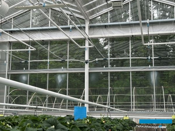 W części szklarni, w której założone zostało doświadczenie z nowoczesna uprawą truskawki była instalacja dodatkowego zraszania. Jak informuje G. Kęszycki, jest to bardzo pomocne narzędzie, które bardzo pomaga w utrzymaniu dobrej dla roślin temperatury. – W połowie czerwca na przykład we wszystkich sektorach szklarni było 40°C, a nawet więcej. Natomiast w części z uprawą truskawek dzięki temu zamgławianiu było 30°C. W takich warunkach 10 stopni C stanowi dużą różnicę, która umożliwia kwitnienie i owocowanie truskawek – stwierdził kierownik obiektów w Opatówku.