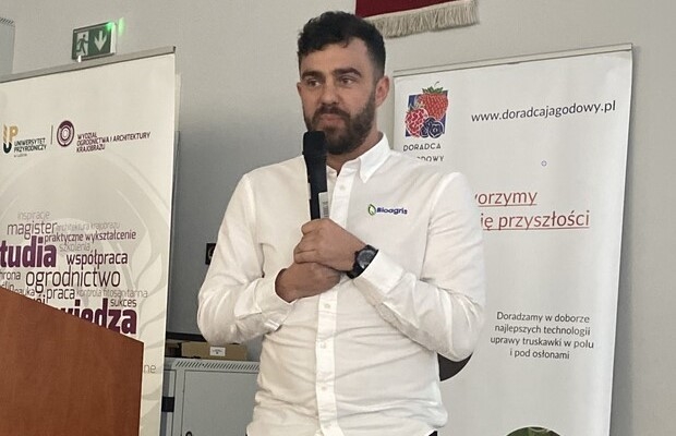 Wykład Szymona Kamińskiego z firmy Bioagris pt. „Sprawdzone techniki poprawy jakości i trwałości owoców miękkich” poświęcony był innowacyjnym rozwiązaniom zwiększającym odporność mechaniczną truskawki i maliny poprzez dokarmianie pozakorzeniowe nawozami zawierającymi wapń (np. Biocal) w połączeniu ze stosowaniem związków blokujących biosyntezę etylenu (np. Xstrass).