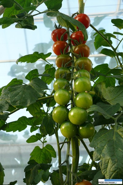 Pomidory zostały ogłowione pod koniec września za 9. gronem. Pod koniec października, gdy odwiedziłam to gospodarstwo rośliny prezentowały się bardzo dobrze, a owoce obu uprawianych odmian były wyrośnięte i wyrównane (prowadzona jest regulacja gron – zwykle do 5 owoców).