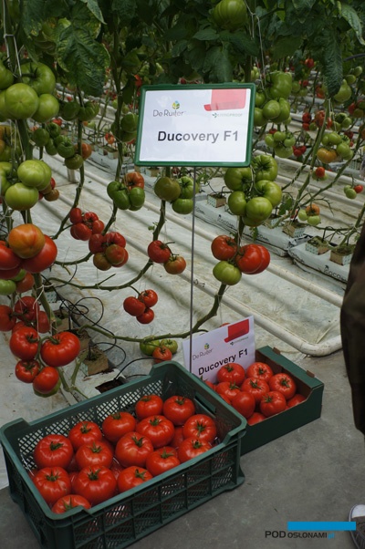 Odmiany pomidorów zaprezentowano w wysokim bloku foliowym, w uprawie bezglebowej w podłożu kokosowym. Były wśród nich zarówno odmiany tunelowe (Mei Shuai F1, Wrestler F1, Partova F1), jak i typowo szklarniowe (wielkoowocowe Torero F1 oraz Ducovery F1), które bardzo dobrze prezentowały się w takich warunkach.