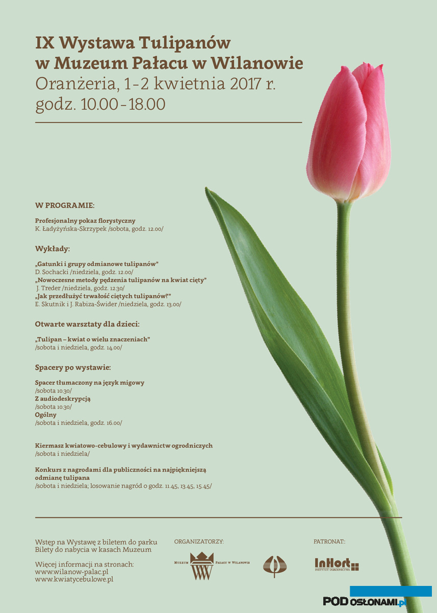 Muzeum Pałacu Króla Jana III w Wilanowie oraz Stowarzyszenie Producentów Ozdobnych Roślin Cebulowych w Skierniewicach zapraszają na IX Wystawę Tulipanów, która odbędzie się w dniach 1–2 kwietnia 2017 r. w Oranżerii Muzeum Pałacu Króla Jana III w Wilanowie.