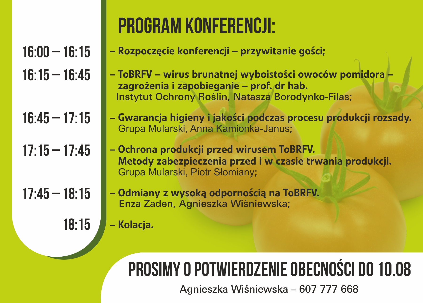 Prezentacje na temat objawów choroby, metod zapobiegania infekcji oraz odmian odpornych wygłoszą prof. dr hab. Natasza Borodynko-Filas (IOR), Anna Kamionka-Janus (Grupa Mularski), Piotr Słomiany (Grupa Mularski) oraz Agnieszka Wiśniewska (Enza Zaden).