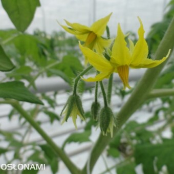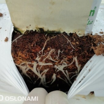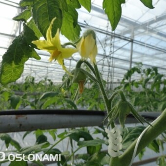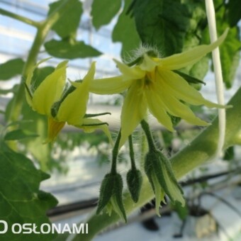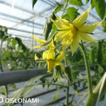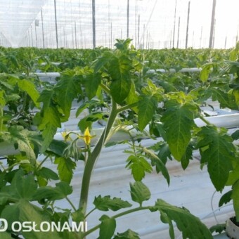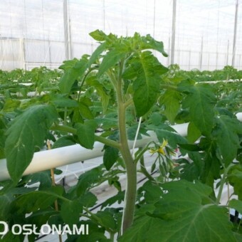 Wczesne nasadzenia pomidorów w rejonie Kalisza. Pierwsze grono pomidorów z nasadzeń grudniowych w nowych i starszych obiektach, uprawy z podwieszaną folią perforowaną. Zdjęcia autorstwa Tomasza Krasowskiego z firmy GreenQ.