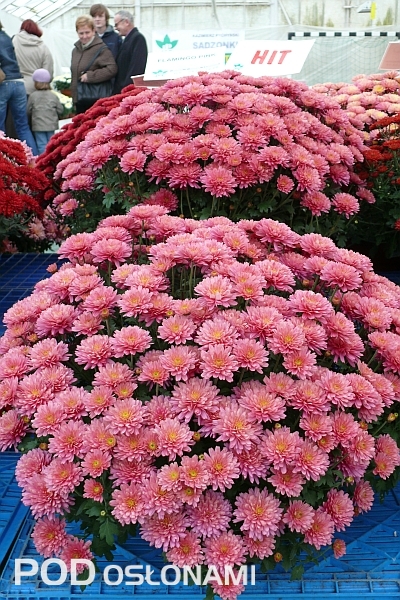 Doniczkowe odmiany chryzantem o kwiatach różowych i liliowych prezentowane podczas spotkania Eurochryzantemy w Praszce