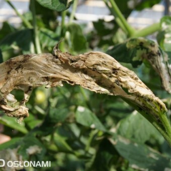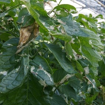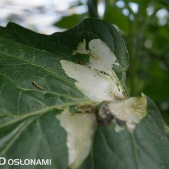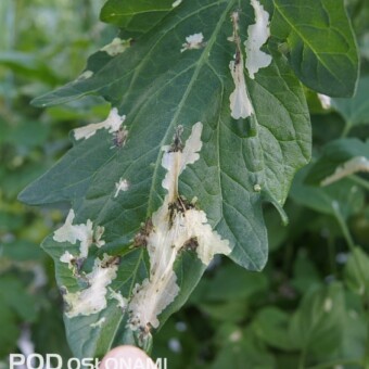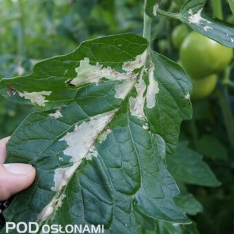 Uszkodzenia liści pomidora na plantacji zaatakowanej przez skośnika pomidorowego