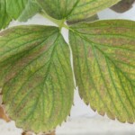 - Liście truskawki przebarwione na skutek żerowania przędziorka chmielowca (fot. DŁB)
