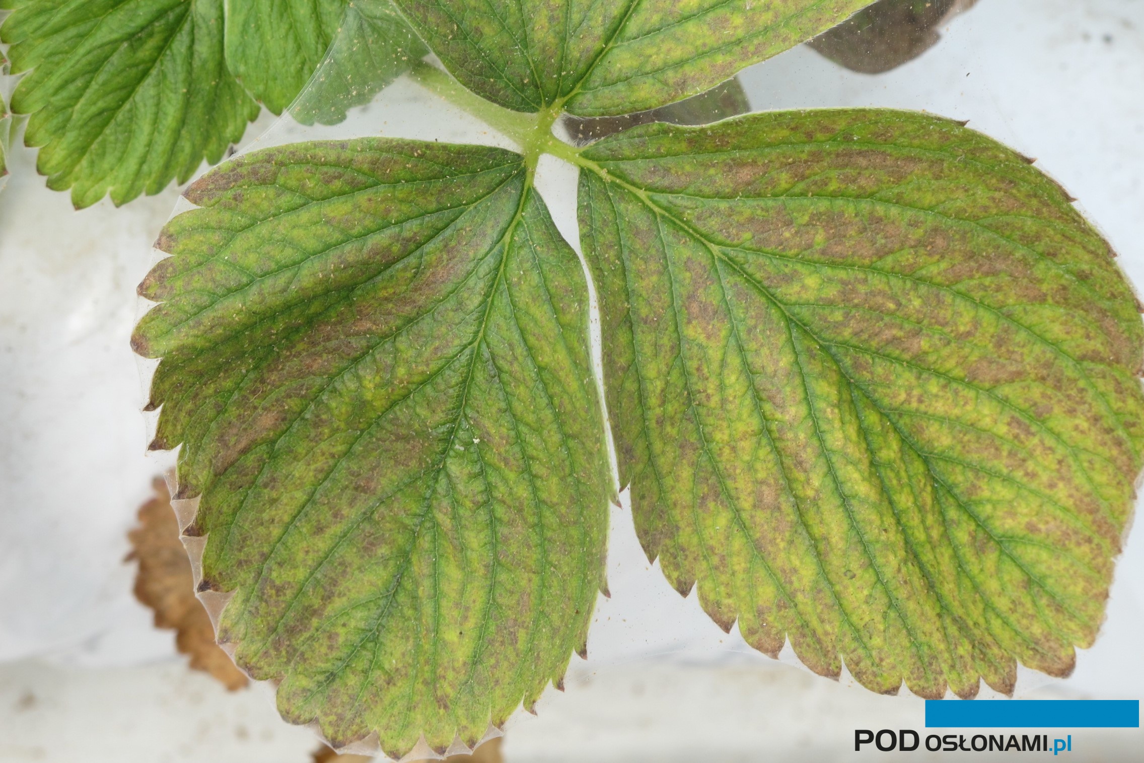 - Liście truskawki przebarwione na skutek żerowania przędziorka chmielowca (fot. DŁB)