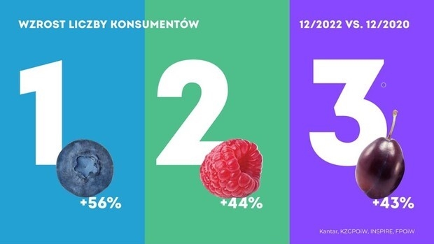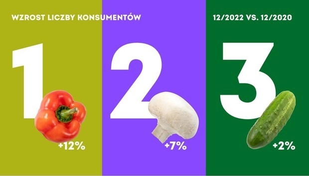 Wśród najpopularniejszych gatunków grudnia Kantar wymienia jabłka, gruszki, śliwki, borówki i maliny, wśród warzyw cebule, pomidory, paprykę i ogórki. W porównaniu do grudnia 2021 roku najbardziej wzrosło spożycie borówek, malin i śliwek. W porównaniu do grudnia 2020 roku wzrost ilości konsumentów borówki wyniósł aż 56%. Wśród warzyw wzrosło spożycie papryki, pieczarek i ogórka. W przypadku papryki wzrost ilości konsumentów w skali dwóch lat wyniósł 12%.