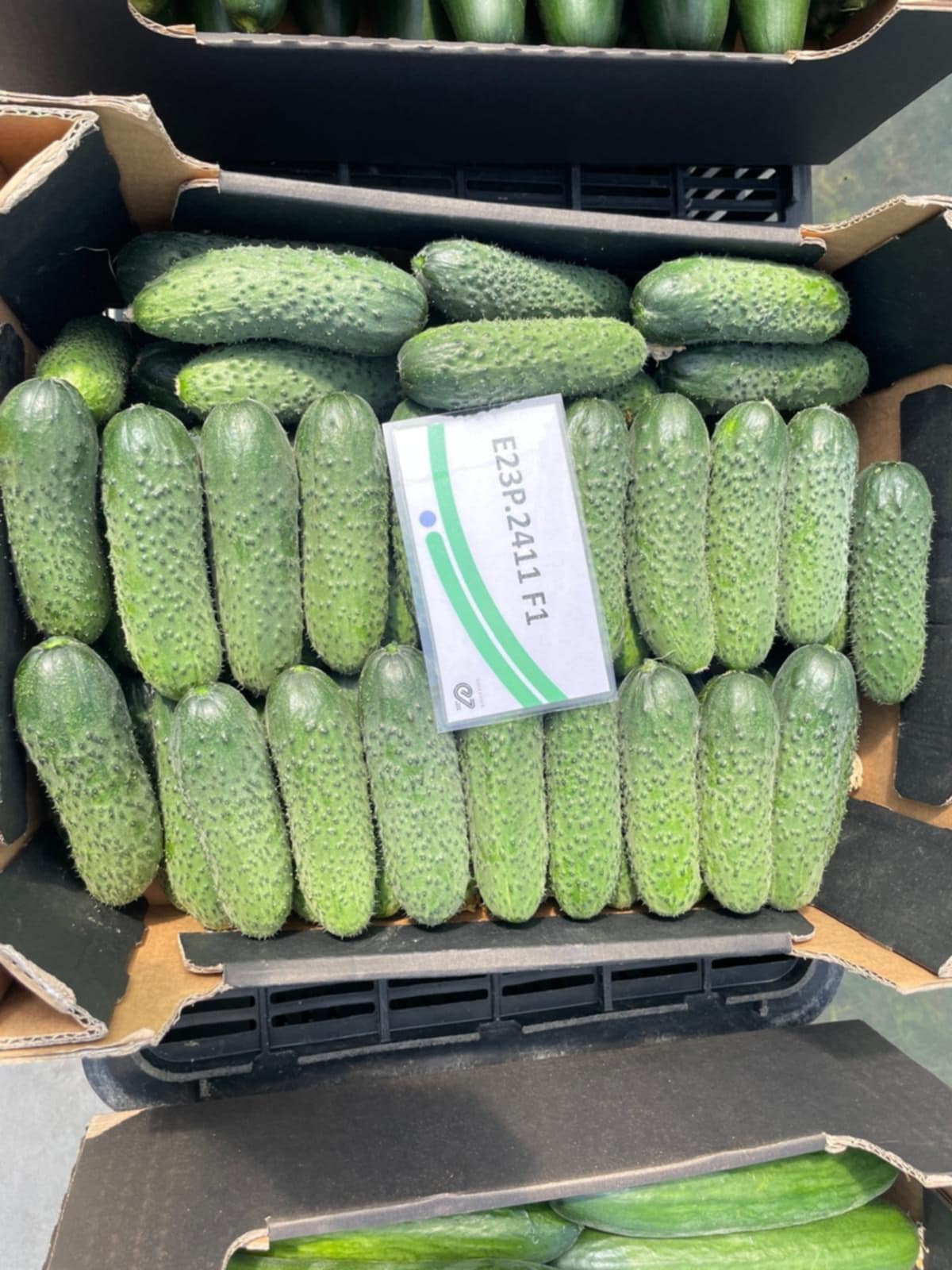 Wysoką odporność na wirus zielonej mozaiki ogórka wprowadzono także u odmian ogórków o krótkich, brodawkowych owocach. Pokazano owoce odmiany testowanej pod numerem E23P.2411, o średniej długości 10-12 cm.